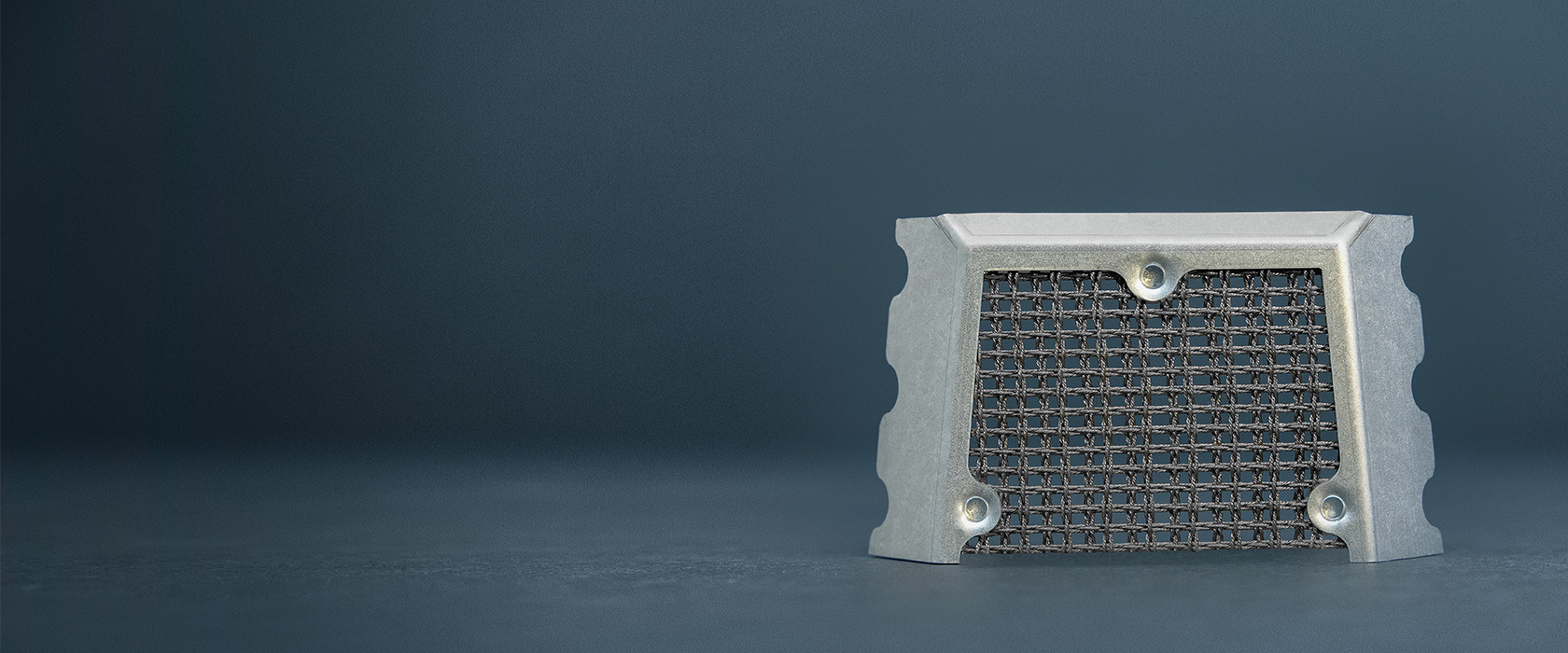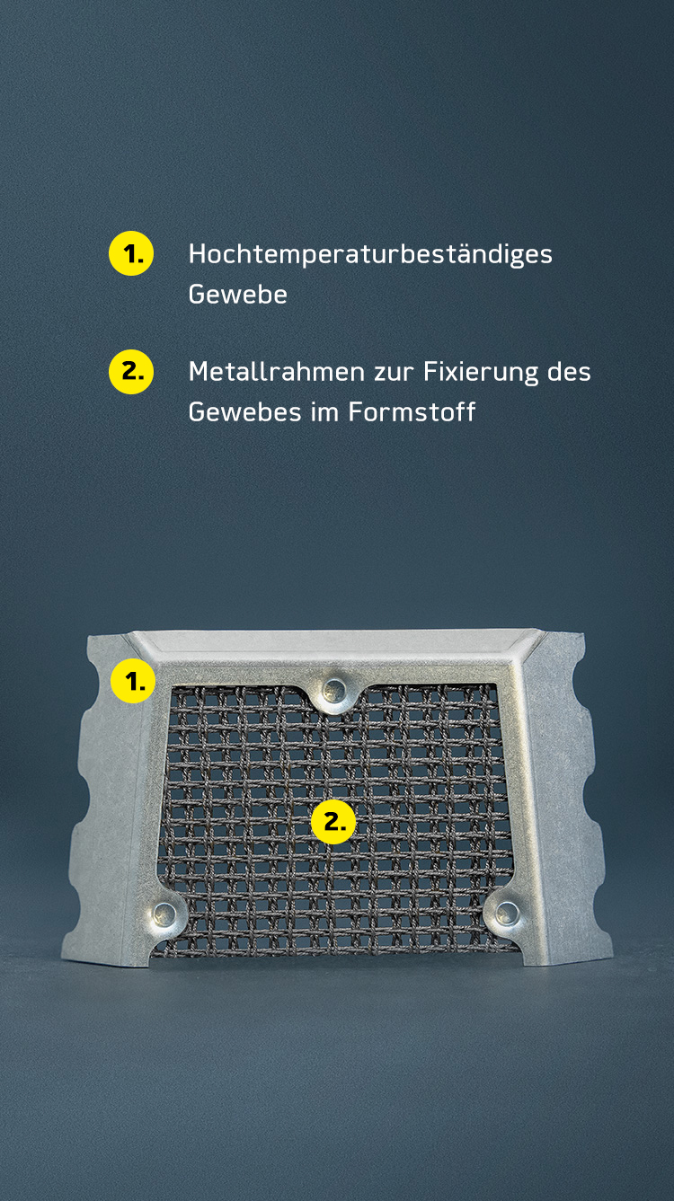 Die NETFrame® Produkte verfügen über ein hochtemperaturbeständiges Gewebe, das in einen speziellen Metallrahmen eingespannt wird. Durch die besondere Form des Rahmens „greift“ dieser in den Formsand und fixiert den NETFrame® direkt an der Bauteiloberfläche.